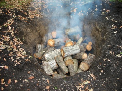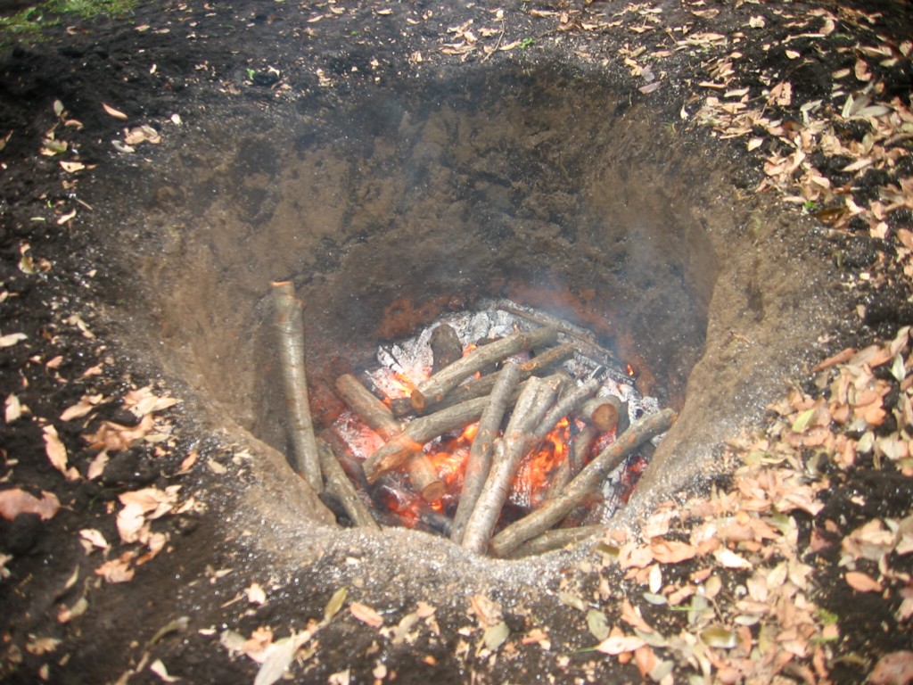 一方、穴焼きでは深さ120cmの穴を掘り、その中で炭を作ります。今回は子供達だけで穴を掘り終えました。よく頑張りました。 |