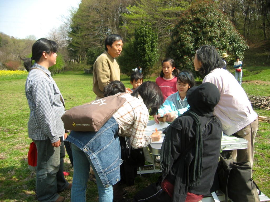 午前10時より受付開始です。当日はなんと140名強の方々が参加くださいました。天気と桜と宣伝効果でしょうか。 |