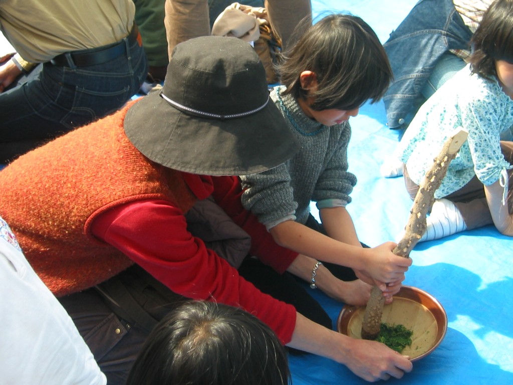 すりつぶしたヨモギと混ぜて捏ね上げます。捏ねるのにはかなり力が要りますが、お母さんも頑張ります。 |