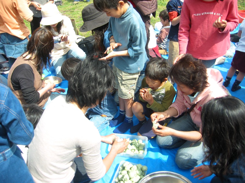 山の緑、桜のピンク、菜の花・タンポポの黄色のコントラストの中、よもぎだんごづくり開催です。 |