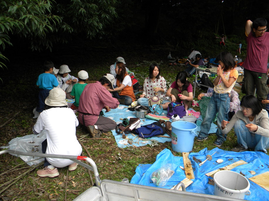 野津田公園ヤマナラシ広場に、約40人ほどがあつまりました。野津田公園に生えている様々な草や木を使い、アクセサリーやお茶や染物を行います。 |