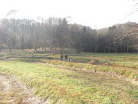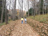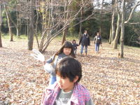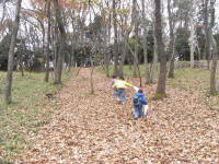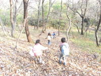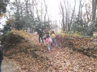 しろやまから坂を駆け下ります。落ち葉に滑ってスッテンコロリン。でもあまり痛くありません。 |