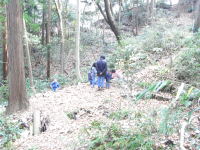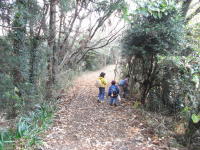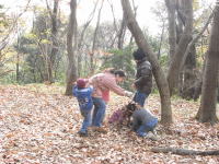切り通しを抜けると、乗越八幡跡に着く。この奥にはこうせん塚、スダジイの巨木がある。すかさず落ち葉合戦が始まる。 |