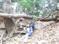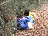 お尻で滑降。枯葉があるから良くすべる!その後、子供は身軽に上がっていく。 |
