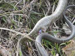 アオダイショウ発見。しかも、2匹が合体中!子ども達に追い回された挙句取り囲まれて虫網でつつかれるかわいそうな蛇たち。 |
