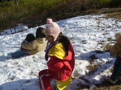 お手伝いしています。 う〜ん、見事なお・し・り! こちらも負けていません。 雪がなくったって、そりすべり♪ だ・る・ま・さ・ん・が