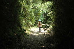 お姉さん達が道草で遊ぶ中、小さな子の方が先を急ぎます。ちょっと待っててね。 |