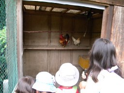 わーニワトリだー、まてー。コケーッコッコッと小屋の中に逃げたけど、最後には追い詰められて…。 |