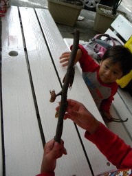近くのパン屋さんでお昼ご飯。飛べなくなったセミを棒につけて遊んでいます… |