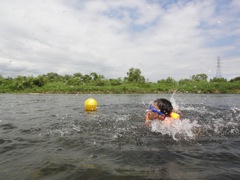 ライフジャケットで川の中。