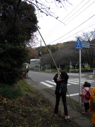 途中、鈴なりの柿。しかも甘柿! 地主の方にお願いしたところ、快くとらせてくれることに。しかも竹でできた高枝ばさみまで貸してくれた!おじさん、ありがとう。 |