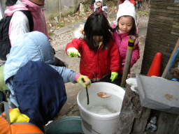この土はどうして崩れてこないんだろうね〜 えい!ガスッ。 こらこら、崩さないように。 |